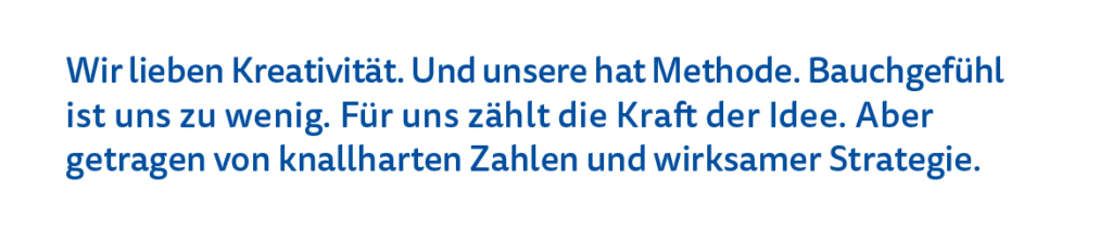 Wir lieben Kreativität. Und unsere hat Methode. Bauchgefühl ist uns zu wenig. Für uns zählt die Kraft der Idee. Aber