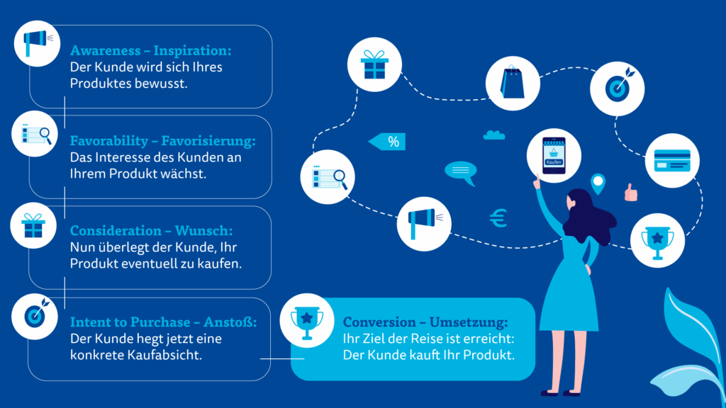Der Kunde unternimmt also eine Art Entwicklungsreise – vom potenziellen zum tatsächlichen Kunden. Richtig: Das erinnert an AIDA (Attention – Aufmerksamkeit, Interest – Interesse, Desire – Verlangen, Action – Handlung) und ist quasi eine Erweiterung.